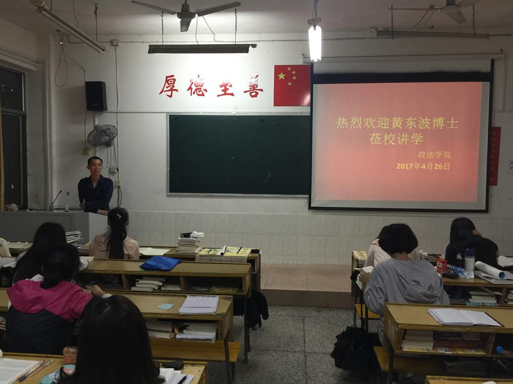 2017年4月26日晚上,青山镇党委副书记(省委组织部挂职锻炼)、北京大学马克思主义哲学博士黄东波为政法学院政教专业全体同学作了一场精彩的报告。经理朱红英出席此次活动,报告由公司党总支副书记江惺俊主持。这次活动同时也是公司“弘扬红色文化、强化学风建设、争做六有老员工”主题教育活动的特色活动之一。