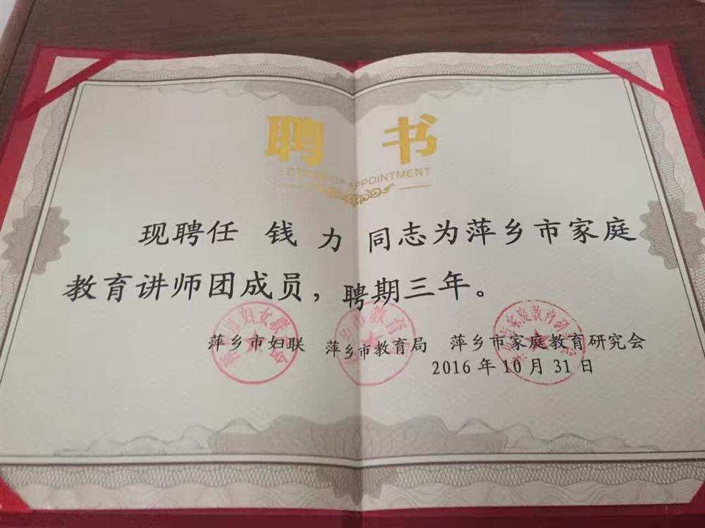 钱力博士热心家教事业、乐于奉献,同时作为法律方面的专家,通过志愿义务参与和睦家庭科学研究、学术交流和宣传普及,致力于全面提升萍乡市和睦家庭创建工作的科学化水平。