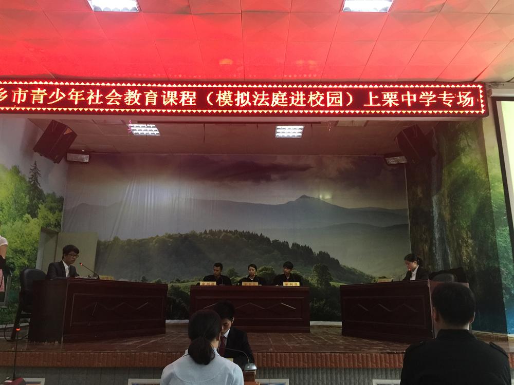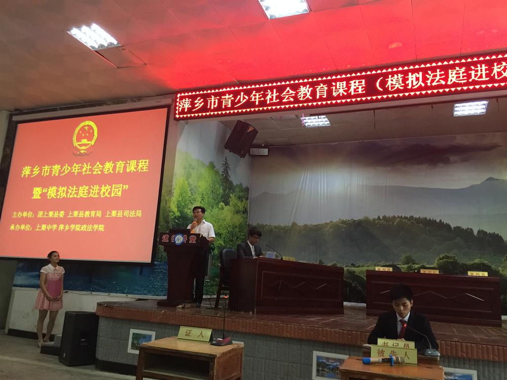 6月1日,政法学院举办的“模拟法庭进校园”活动在上栗中学“开庭”。来自太阳集团tyc86、团上栗县委、上栗县教育局、上栗县司法局、上栗中学的部分领导、老师和千余名同学出席活动。