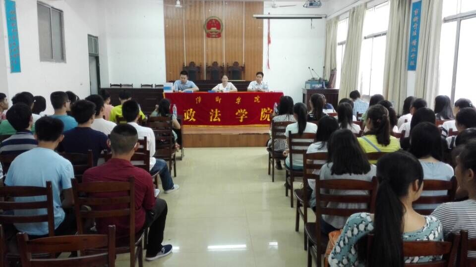 根据学校有关精神,政法学院在2015年9月4—6日完成了接待2015级新生入学的工作,到校新生均已安排妥当,并于9月7日上午在学院模拟法庭(英华楼一楼)召开了师生见面会,经理朱红英、党总支书记叶继林、党总支副书记江惺俊和全体教师,以及2015级全体新生和部分员工会干部参加了会议。会议由江惺俊副书记主持。