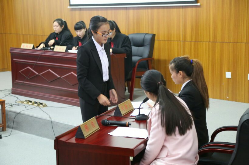 法律班同学所扮演。主持人宣布庭审开始,随后书记员宣读法庭纪律,全场起立,审判长宣布开庭。书记员陈述诉讼人、参与人的基本情况后,原告代理人进行陈述诉讼请求和诉讼原因,在核实当事人并告知诉讼权利后,开始法庭调查。双方代理人都提供了有关证物和证人,并为委托当事人进行辩护,为此案件争论的焦点提出自己的见解,维护委托当事人的利益。在法庭辩论环节,双方各持一词,展开激烈交锋。审判长宣布合议庭休庭十分钟,随后再次开庭,审判长庄严地宣读了判决书,模拟审判在师生们的热烈掌声中结束。