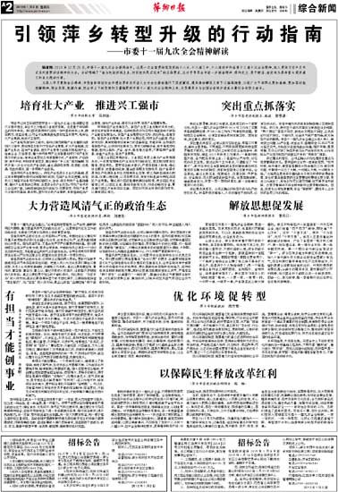 2014年12月26日,萍乡市委十一届九次全会胜利召开。这是一次全面贯彻落实党的十八大、十八届三中、十八届四中和省委十三届十次全会精神,深入贯彻习近平总书记系列重要讲话精神的大会。会议明确了“奋力把经济搞上去,切实把作风正过来”的总体要求,这对于号召全市进一步振奋精神、保持定力、勇于担当、奋发有为具有重大现实意义和巨大推动作用。