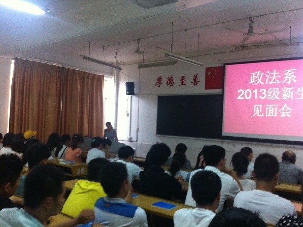 2013年9月4日上午9点,政法系在跬步楼104召开了13级新生入学教育大会。此次大会旨在帮助新生进一步了解学校历史及所学专业,从而尽快融入老员工活。系主任朱红英、系党总支书记叶继林、辅导员刘萍以及全体教师出席了会议。