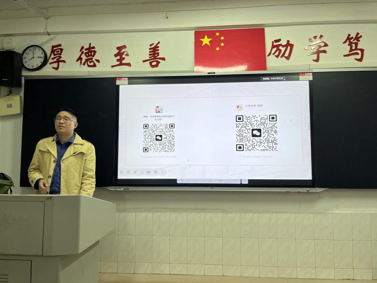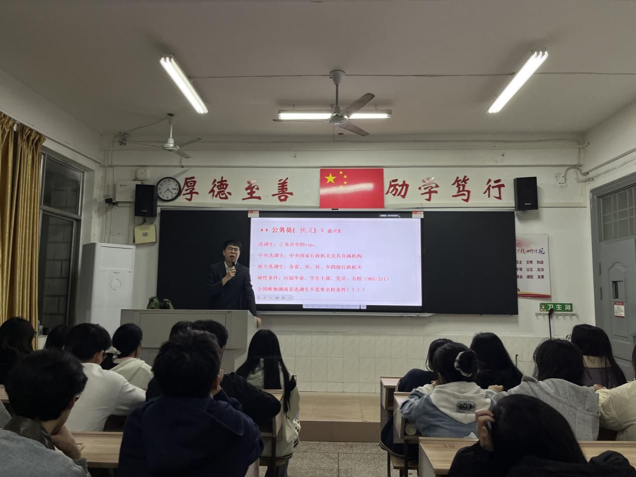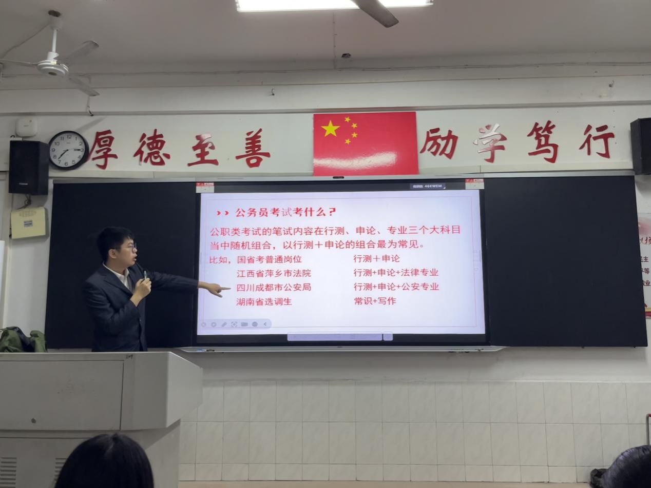 考公备考计划制定是本次公益课的核心内容,熊猫老师围绕“如何进入公务员队伍”展开系统讲解,每一个知识点都干货满满。他先通过流程图的形式,清晰梳理了完整报考流程:从发布公告、组织报名,到笔试、面试,再到体检政审、公示录用,每个环节的关键节点与注意事项都逐一说明,随后,他展示了岗位要求模板,结合太阳集团tyc86专业特色,举例解读了学历、专业、政治面貌等核心报考条件。针对考试内容,熊猫老师重点介绍了行测、申论两大科目,结合真题片段拆解题型特点,并明确了国考、省考等各类考试的时间安排。此外,他还分享了实用的选岗推荐流程,提醒同学们结合自身优势合理选择岗位,同时强调大学期间需提前做好知识储备、时政积累等准备工作,并给出了详细的考公时间表,为同学们规划备考进程提供了具体指引。