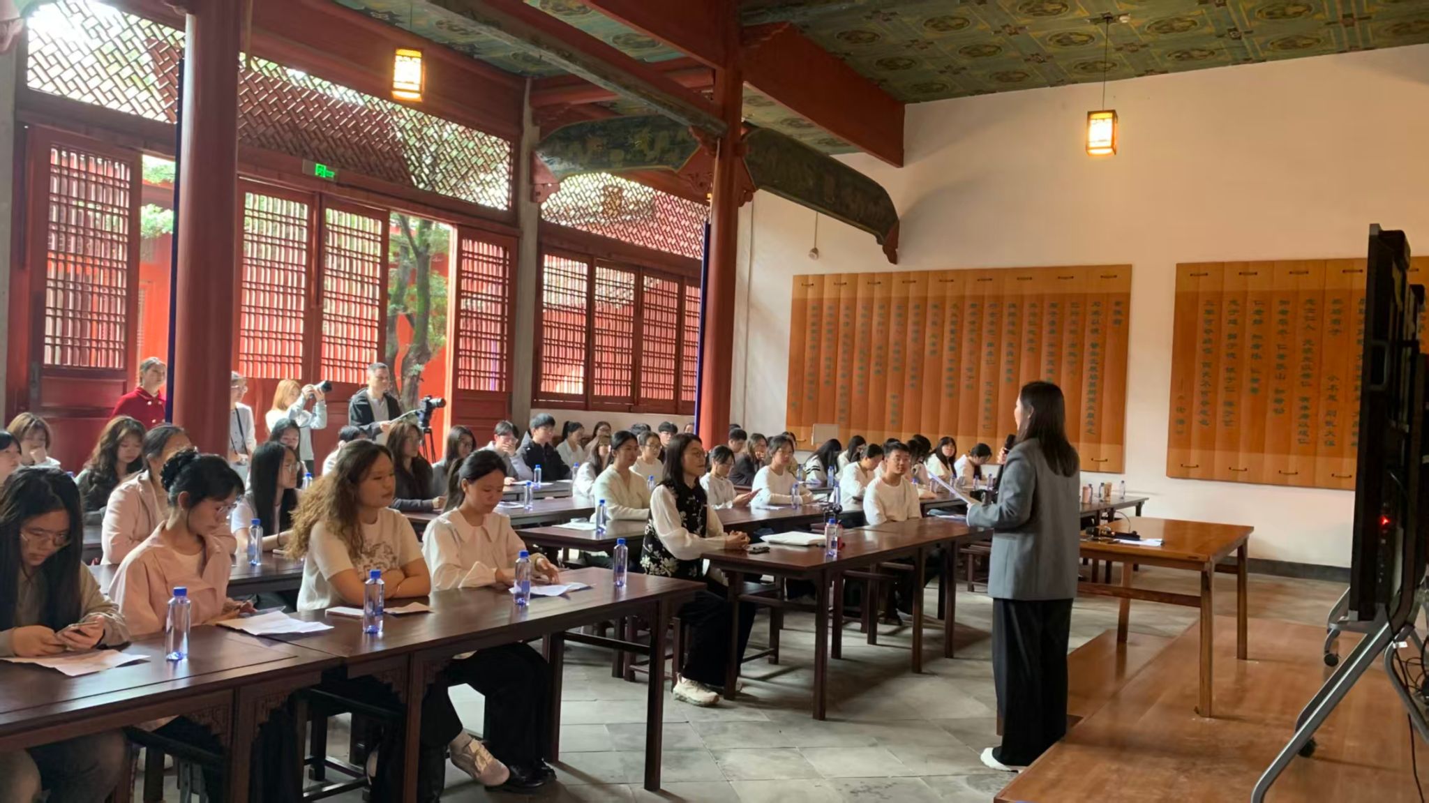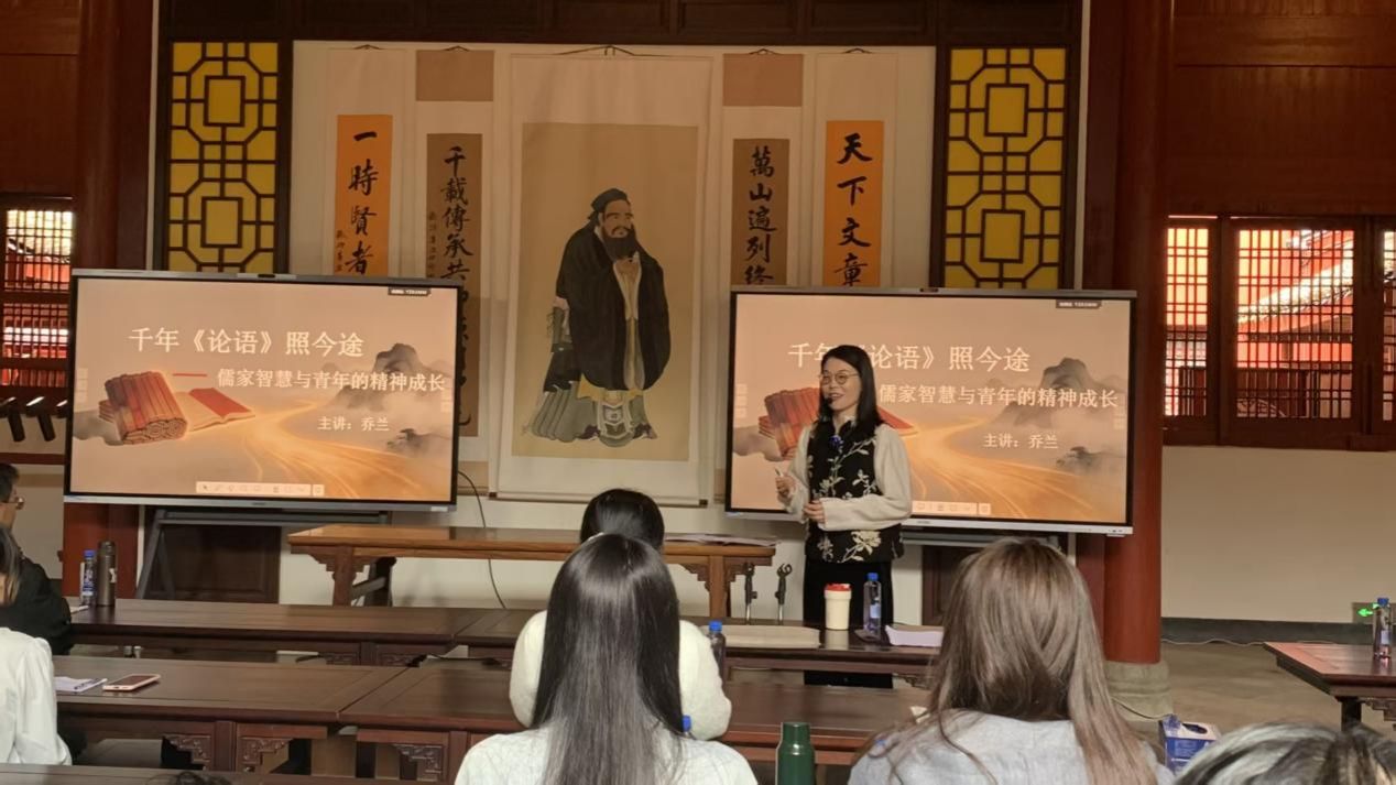 随后,乔兰副教授以“时代三问”为引,开启主题授课:AI时代,我们为何仍需研读《论语》?青年应如何品读经典?新时代青年又当如何真正传承儒家智慧?她强调,研读经典需摒弃形式主义,真正掌握研读方法,让儒家智慧滋养心灵;传承文化更要立足当下,将传统智慧融入现代生活与社会实践,实现创造性转化与创新性发展。课堂上,师生围绕儒家文化与青年精神成长展开互动,传统智慧与时代价值在此碰撞交融。