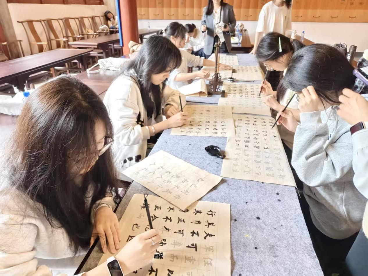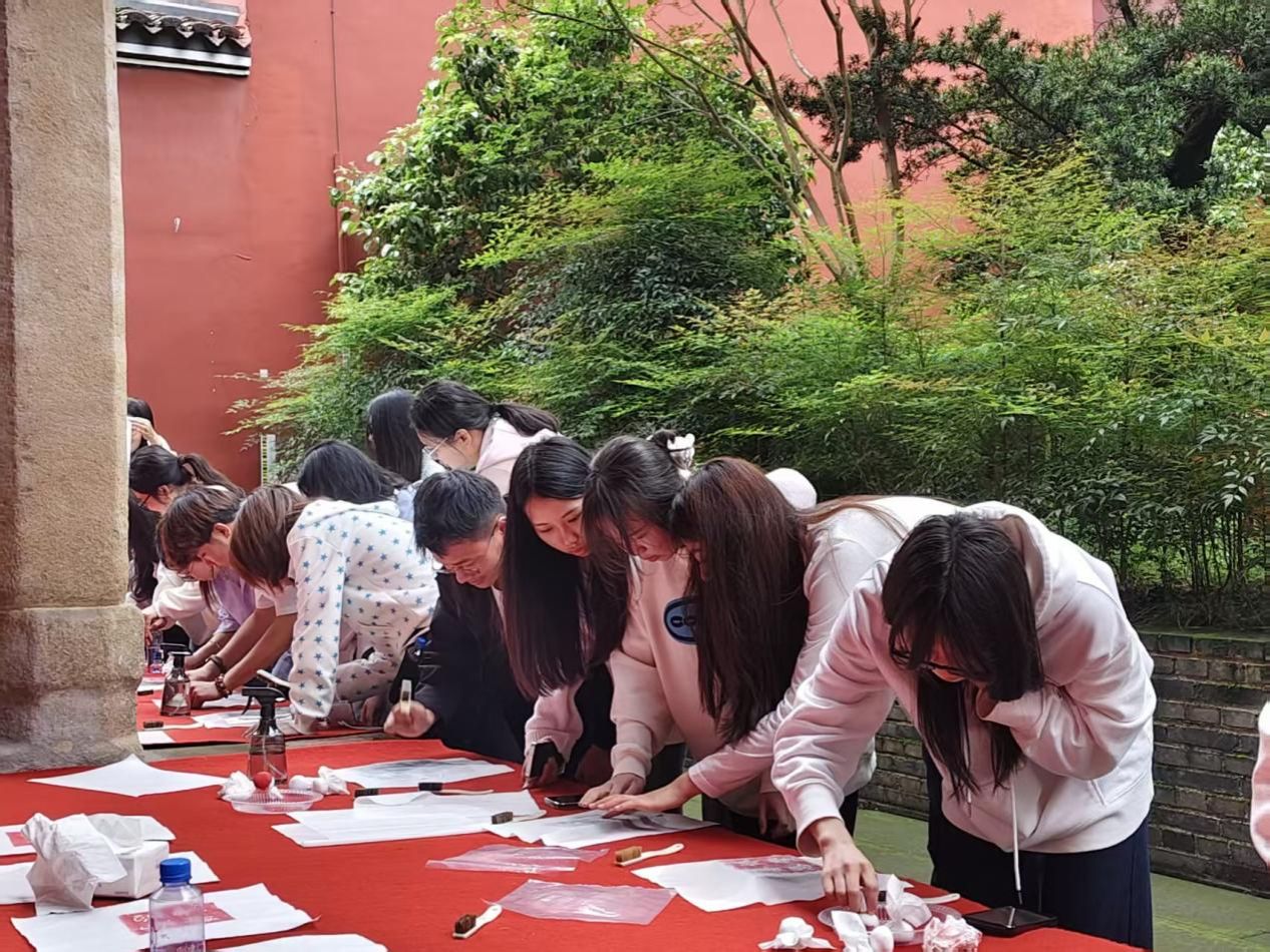 讲解结束后,讲解员组织同学们亲手体验红色拓印技艺,让大家在实践中感受非物质文化遗产的独特魅力;随后又开展了毛笔书法活动,师生们挥毫泼墨,在一撇一捺间体悟中华文脉的传承。整个过程中,同学们参与热情高涨,不仅丰富了学识,更在沉浸式体验中厚植了家国情怀。