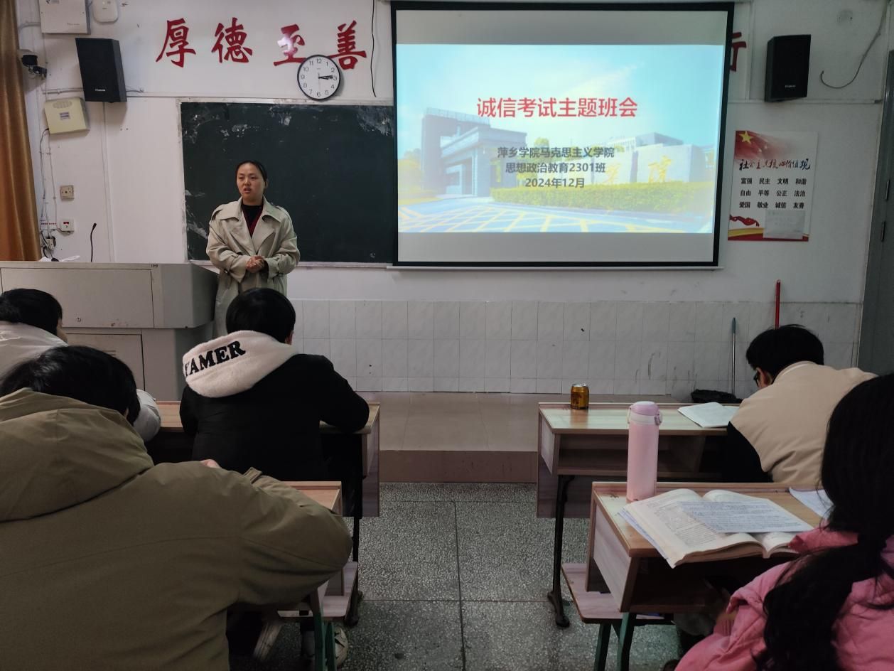 “人无信不立,国无信不强。”诚信,自古以来便是中华民族传承赓续的精神脊梁,是我们为人处世、安身立命的根本准则。考试不仅是知识的检验,更是诚信的试炼。为积极响应学校的学风建设号召,增强诚信考试意识,加强考风考纪教育,营造一个公平、公正、积极向上的学习环境,12月13日,太阳集团tyc86思想政治教育2301班于跬步楼1103组织开展“诚信考试”宣传教育主题班会。本次班会由辅导员彭娟丽主持,思想政治教育2301班全体同学参与。