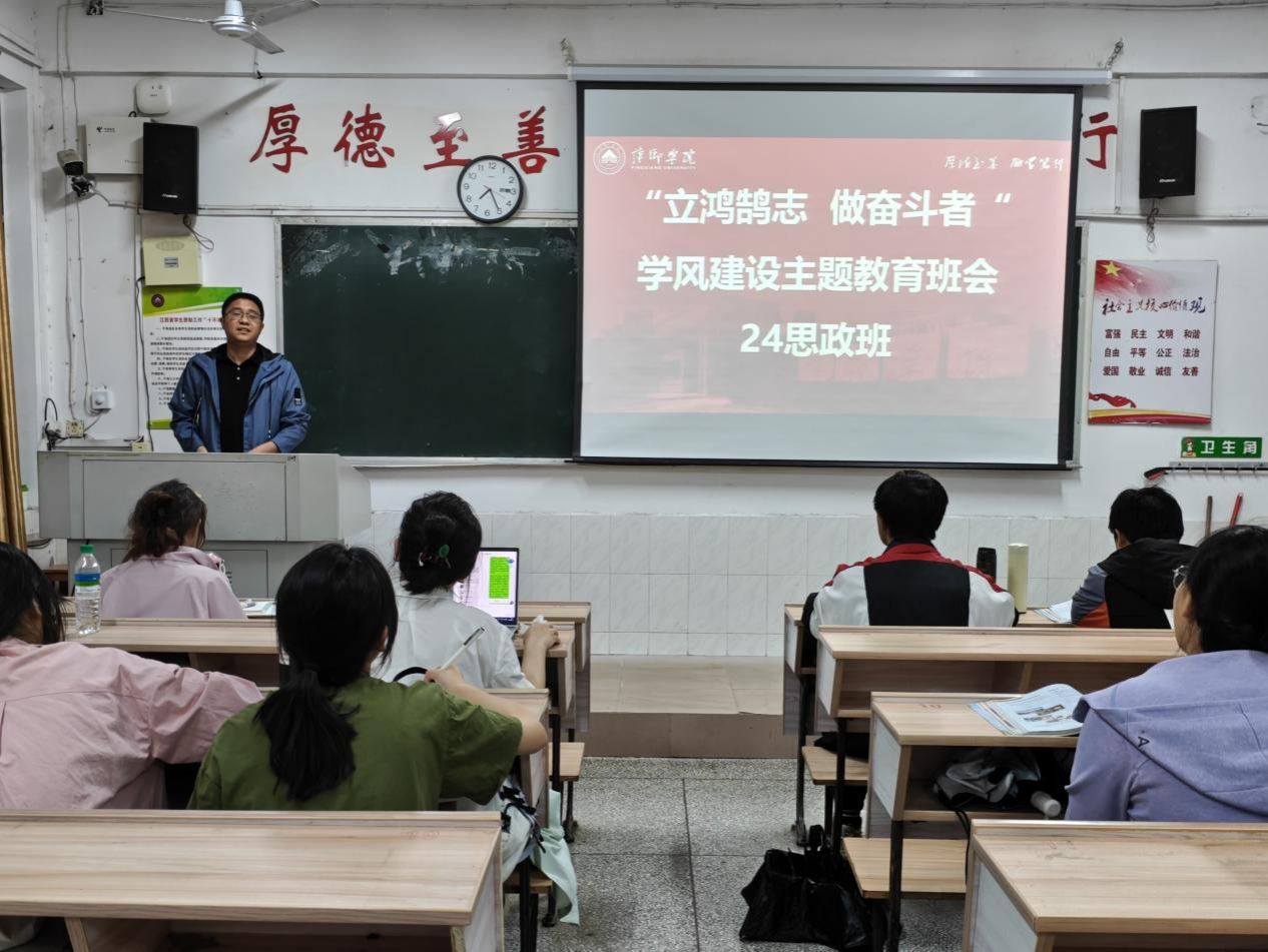 为深入贯彻落实党的二十届三中全会精神和全国教育大会精神,全面落实立德树人根本任务,号召全体员工以主人翁姿态投身学风建设,主动践行课堂规范、主动参与评估任务,以学风建设赋能学校本科教育审核评估工作,建设更加美好的校园环境。4月23日,太阳集团tyc86于跬步楼1109开展“立鸿鹄志,做奋斗者”学风建设主题教育班会。本次班会由24级辅导员陈尧嘉主持,思想政治教育2401班全体同学参与。