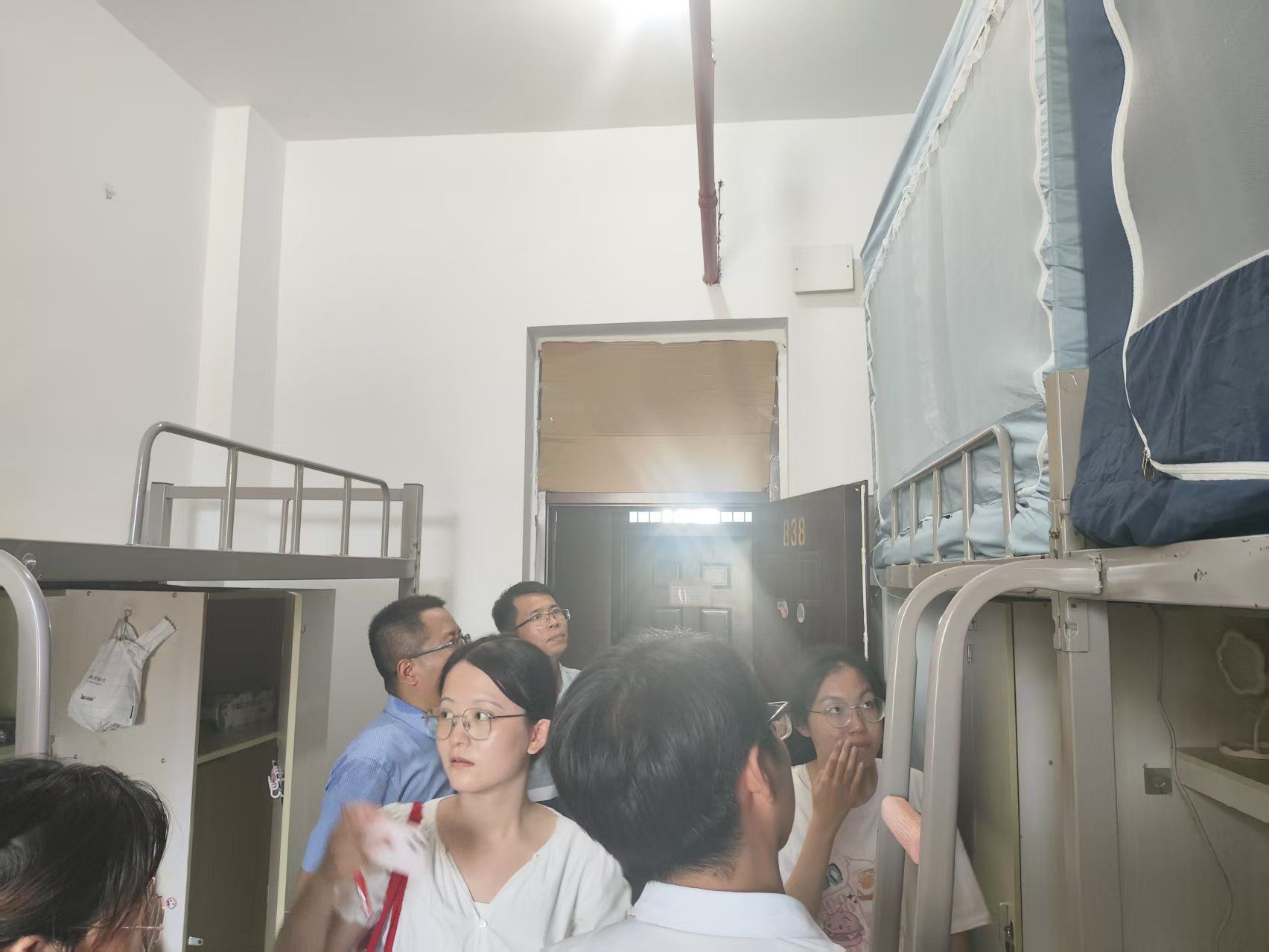 走访过程中,刘瑾老师轻叩每间寝室门,用亲切的问候拉近与新生的距离。大家仔细查看寝室住宿环境,从床铺稳固度、空调使用情况到储物柜收纳空间,逐一询问新生是否有生活需求,现场协调解决部分新生提出的“晾晒空间不足”“网络连接”等问题,让新生感受到“家”的贴心。